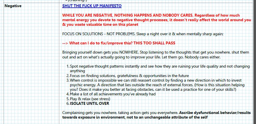 - Learn how to effectively control your emotions. This could be a post by itself but what I do is make an IF > THEN plan to deal with the most common negative/blocking emotions I feel. Here is an example of how I routinely fix negativity. These should be as automated as possible.