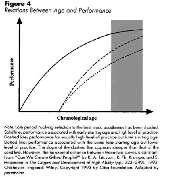 People who start young take less time: both onset and the rate of expertise acquisition are accelerated”